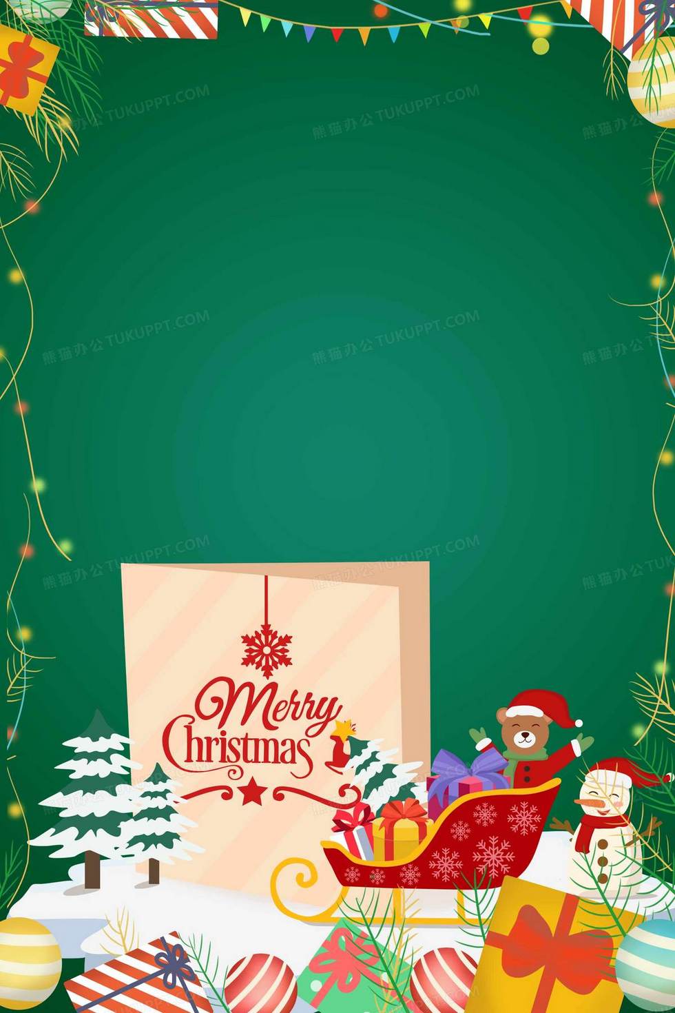 本作品内容为圣诞节绿色节日边框背景, 格式为 psd, 大小17 MB, 图片尺寸为2362 x 3543, 作品中背景图片无需修改, 源文件无水印,可以直接使用, 欢迎使用熊猫办公。 如认为平台内容涉嫌侵权,可通过邮件:tousu@tukuppt.com提出书面通知,我们将及时处理。