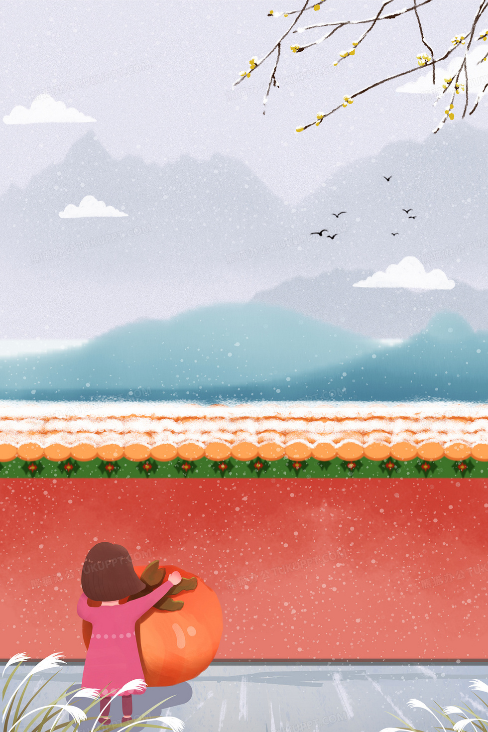 本作品内容为创意手绘卡通女孩摘柿子冬天背景, 格式为 psd, 大小94 MB, 图片尺寸为3543 x 5315, 作品中背景图片无需修改, 源文件无水印,可以直接使用, 欢迎使用熊猫办公。 如认为平台内容涉嫌侵权,可通过邮件:tousu@tukuppt.com提出书面通知,我们将及时处理。