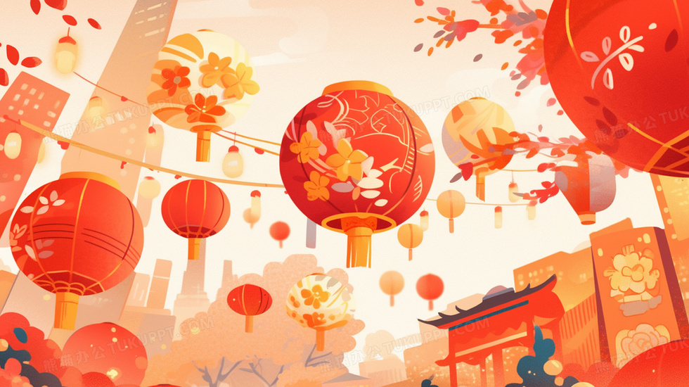 本作品内容为中国新年鲜花彩灯灯笼装饰插画, 格式为 jpg, 大小2 MB, 图片尺寸为1456 x 816, 源文件无水印, 欢迎使用熊猫办公。 如认为平台内容涉嫌侵权,可通过邮件:tousu@tukuppt.com提出书面通知,我们将及时处理。