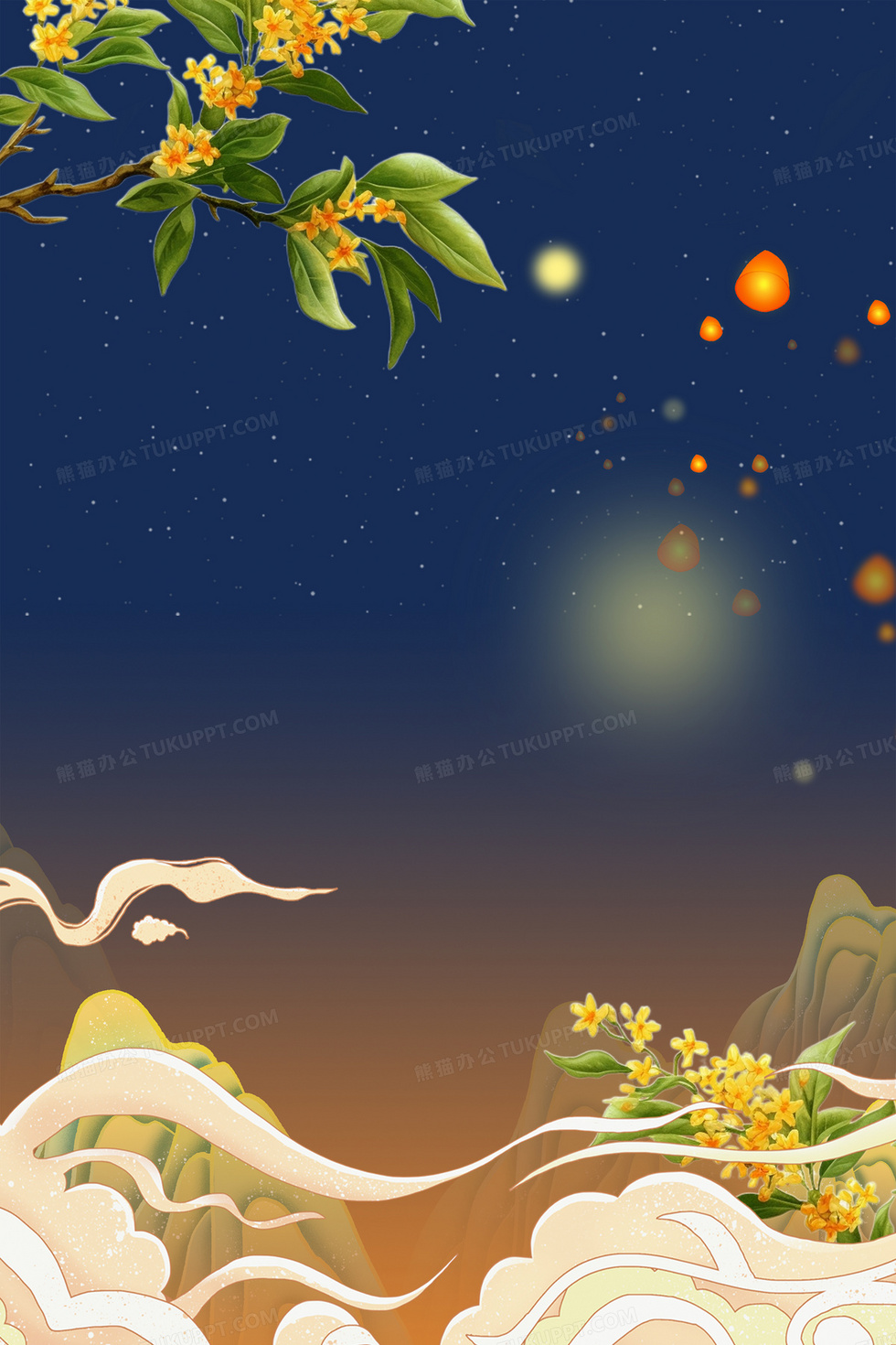 本作品内容为中秋节文艺清新桂花背景, 格式为 psd, 大小78 MB, 图片尺寸为3543 x 5315, 作品中背景图片无需修改, 源文件无水印,可以直接使用, 欢迎使用熊猫办公。 如认为平台内容涉嫌侵权,可通过邮件:tousu@tukuppt.com提出书面通知,我们将及时处理。