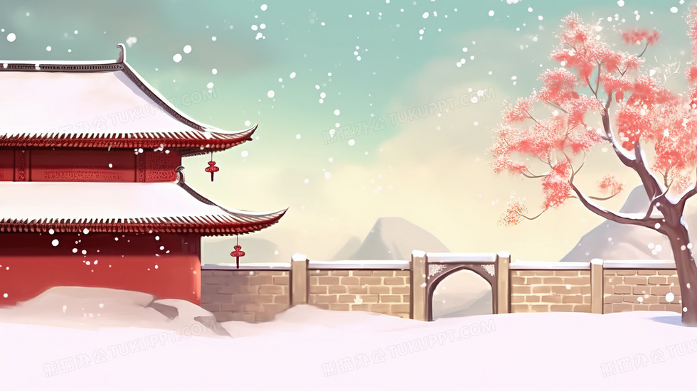本作品内容为冬季古典建筑雪景梅花插画, 格式为 jpg, 大小5 MB, 图片尺寸为2912 x 1632, 源文件无水印, 欢迎使用熊猫办公。 如认为平台内容涉嫌侵权,可通过邮件:tousu@tukuppt.com提出书面通知,我们将及时处理。