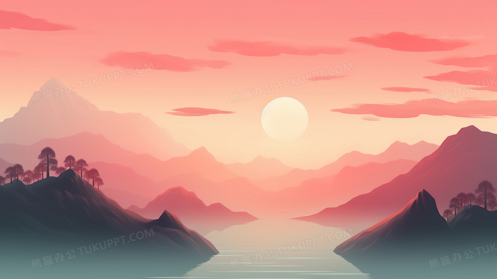 本作品内容为红色夕阳中国风山水风景意境插画, 格式为 jpg, 大小3 MB, 图片尺寸为2912 x 1632, 源文件无水印, 欢迎使用熊猫办公。 如认为平台内容涉嫌侵权,可通过邮件:tousu@tukuppt.com提出书面通知,我们将及时处理。