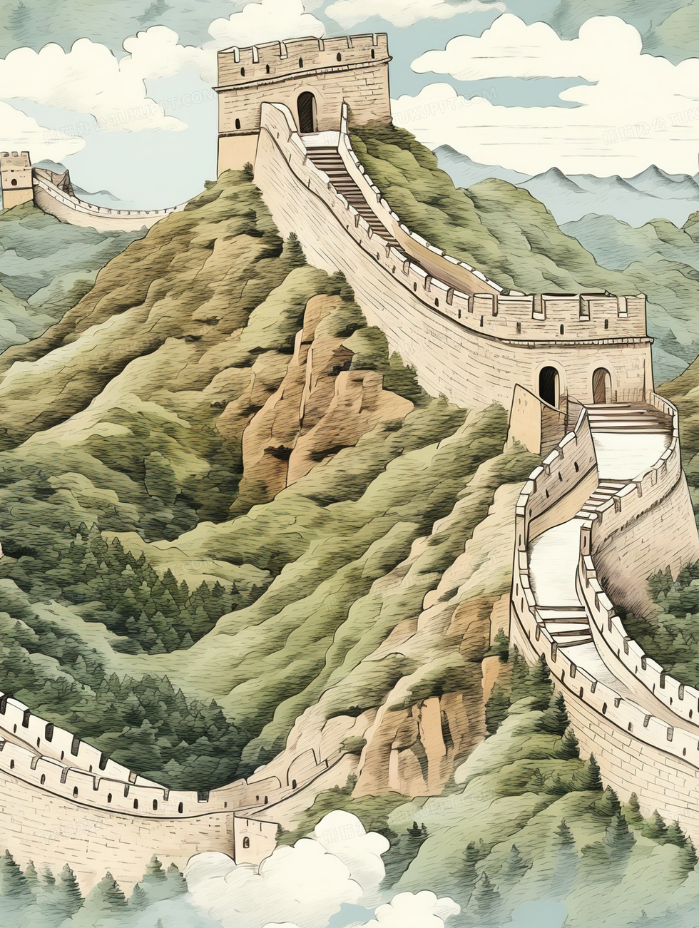 本作品内容为中国万里长城建筑风景插画, 格式为 jpg, 大小8 MB, 图片尺寸为1856 x 2464, 源文件无水印, 欢迎使用熊猫办公。 如认为平台内容涉嫌侵权,可通过邮件:tousu@tukuppt.com提出书面通知,我们将及时处理。