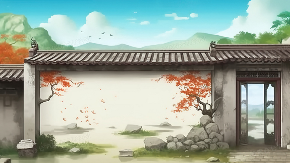 本作品内容为古典建筑院墙上的中国风山水风景彩绘插画, 格式为 jpg, 大小5 MB, 图片尺寸为2912 x 1632, 源文件无水印, 欢迎使用熊猫办公。 如认为平台内容涉嫌侵权,可通过邮件:tousu@tukuppt.com提出书面通知,我们将及时处理。