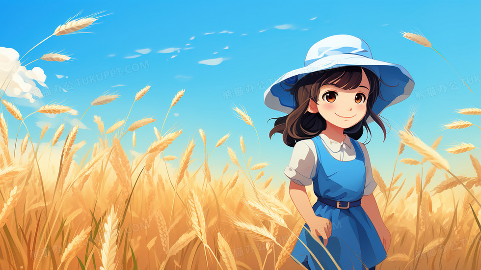 本作品内容为丰收的金色麦田里穿蓝色裙子的女孩插画, 格式为 jpg, 大小5 MB, 图片尺寸为2912 x 1632, 源文件无水印, 欢迎使用熊猫办公。 如认为平台内容涉嫌侵权,可通过邮件:tousu@tukuppt.com提出书面通知,我们将及时处理。