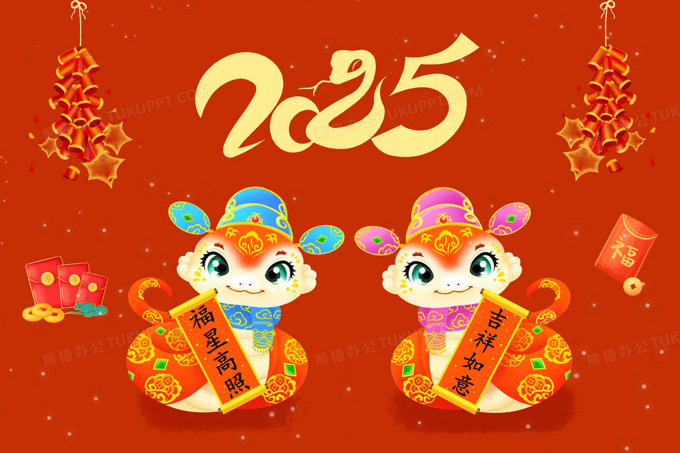 本作品内容为蛇年2025对联创意插画, 格式为 psd, 大小8 MB, 请使用软件PhotoShop(CC)打开, 源文件无水印, 欢迎使用熊猫办公。 如认为平台内容涉嫌侵权,可通过邮件:tousu@tukuppt.com提出书面通知,我们将及时处理。