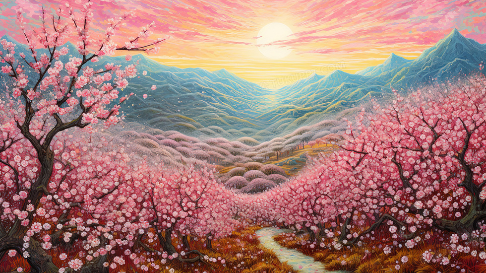 首页 > 插画 > 科技艺术 > 水彩手绘 > 漫山遍野盛开的桃花插画