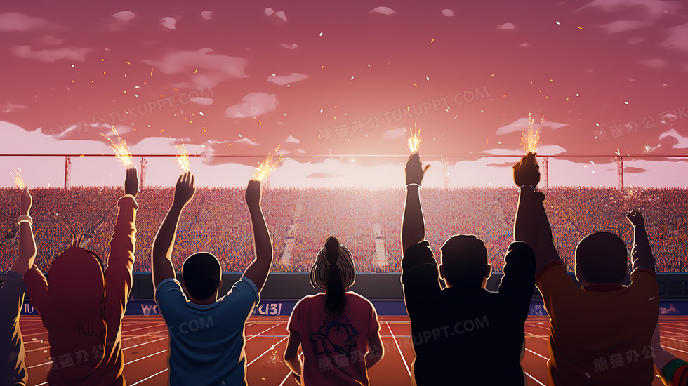 本作品内容为赛场上观众们欢呼庆祝的背影插画, 格式为 jpg, 大小6 MB, 图片尺寸为2912 x 1632, 源文件无水印, 欢迎使用熊猫办公。 如认为平台内容涉嫌侵权,可通过邮件:tousu@tukuppt.com提出书面通知,我们将及时处理。