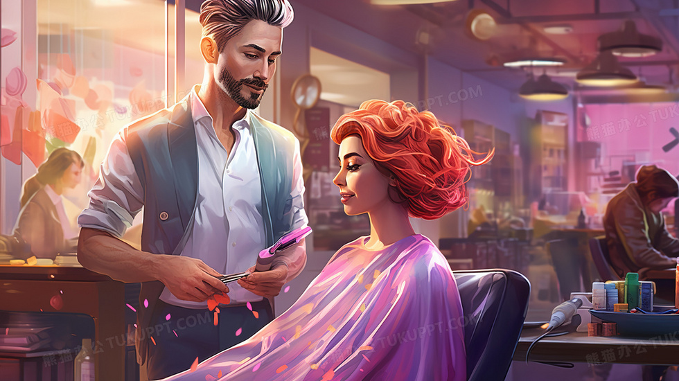 本作品内容为给女士美发的男性发型师插画, 格式为 jpg, 大小3 MB, 图片尺寸为2912 x 1632, 源文件无水印, 欢迎使用熊猫办公。 如认为平台内容涉嫌侵权,可通过邮件:tousu@tukuppt.com提出书面通知,我们将及时处理。