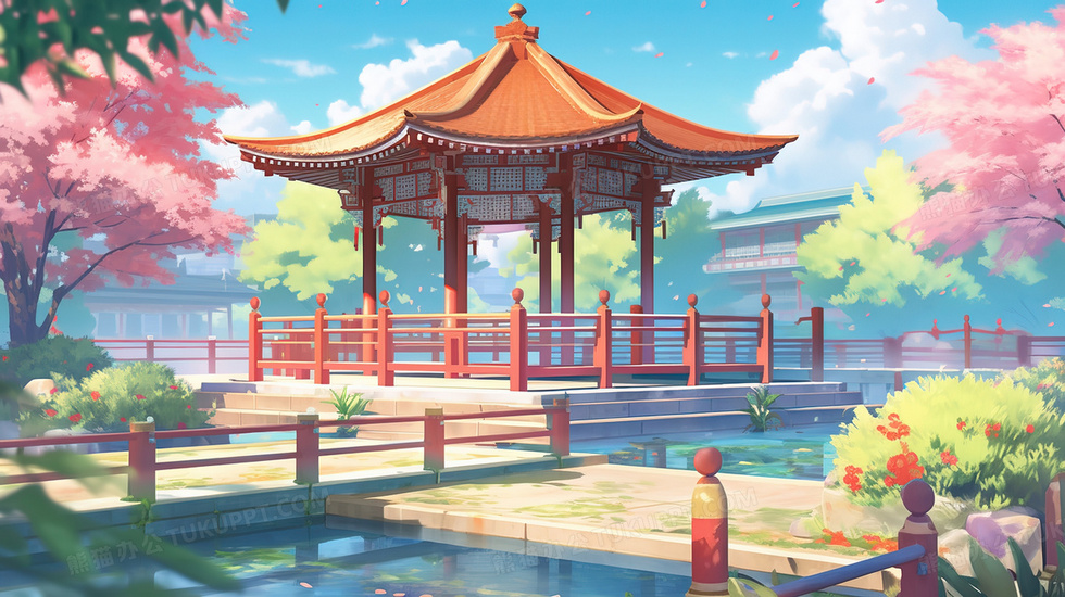 本作品内容为春季公园里精致的凉亭插画, 格式为 jpg, 大小3 MB, 图片尺寸为2912 x 1632, 源文件无水印, 欢迎使用熊猫办公。 如认为平台内容涉嫌侵权,可通过邮件:tousu@tukuppt.com提出书面通知,我们将及时处理。