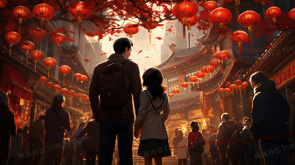 本作品内容为红色中国春节情侣集市逛灯会插画, 格式为 jpg, 大小4 MB, 图片尺寸为2912 x 1632, 源文件无水印, 欢迎使用熊猫办公。 如认为平台内容涉嫌侵权,可通过邮件:tousu@tukuppt.com提出书面通知,我们将及时处理。