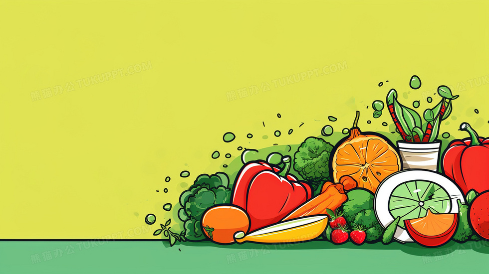 本作品内容为绿色蔬菜水果美食插画, 格式为 jpg, 大小4 MB, 图片尺寸为2912 x 1632, 源文件无水印, 欢迎使用熊猫办公。 如认为平台内容涉嫌侵权,可通过邮件:tousu@tukuppt.com提出书面通知,我们将及时处理。