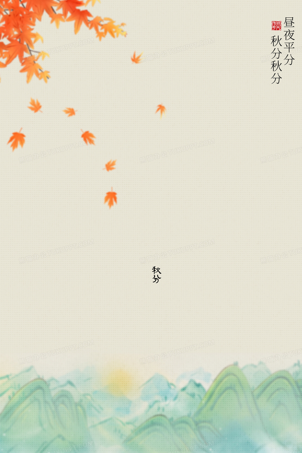 本作品内容为简约古风秋分节气合成背景, 格式为 psd, 大小24 MB, 图片尺寸为3543 x 5314, 作品中背景图片无需修改, 源文件无水印,可以直接使用, 欢迎使用熊猫办公。 如认为平台内容涉嫌侵权,可通过邮件:tousu@tukuppt.com提出书面通知,我们将及时处理。