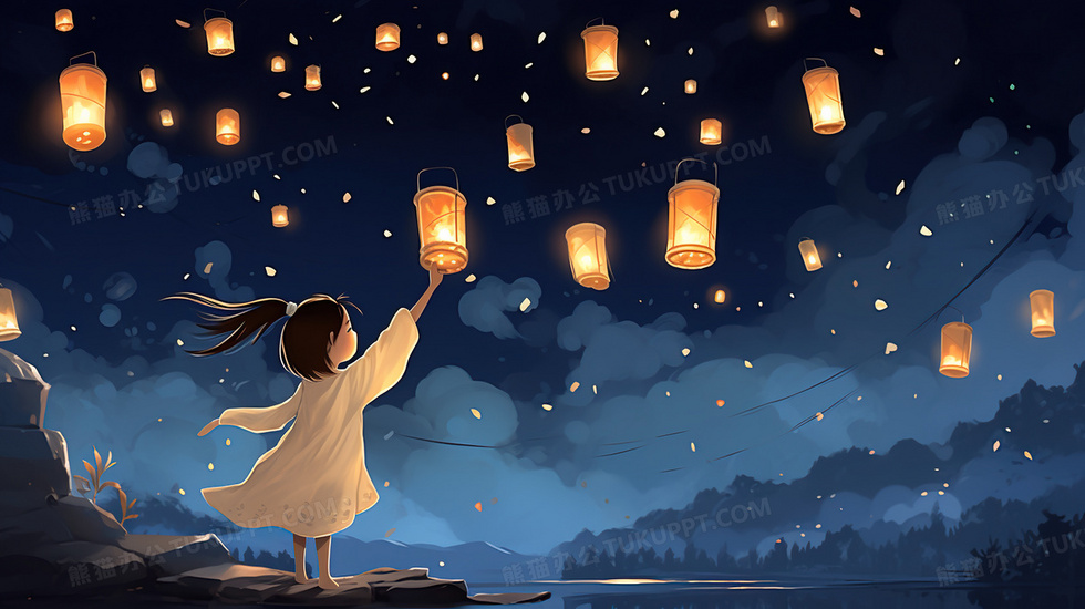 本作品内容为古代人物放飞孔明灯祈福的场景创意插画, 格式为 jpg, 大小5 MB, 图片尺寸为2912 x 1632, 源文件无水印, 欢迎使用熊猫办公。 如认为平台内容涉嫌侵权,可通过邮件:tousu@tukuppt.com提出书面通知,我们将及时处理。