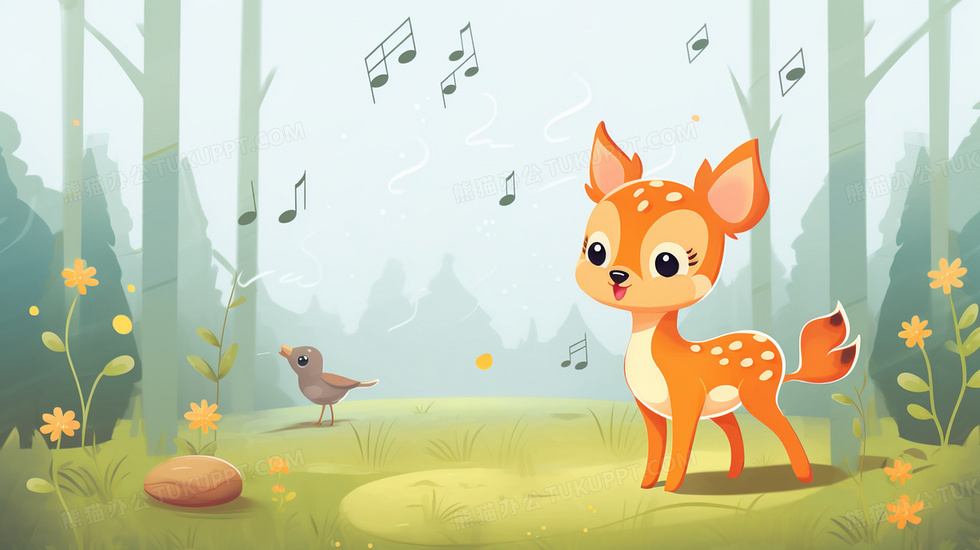 本作品内容为绿色森林听小鸟歌唱的小麋鹿插画, 格式为 jpg, 大小4 MB, 图片尺寸为2912 x 1632, 源文件无水印, 欢迎使用熊猫办公。 如认为平台内容涉嫌侵权,可通过邮件:tousu@tukuppt.com提出书面通知,我们将及时处理。