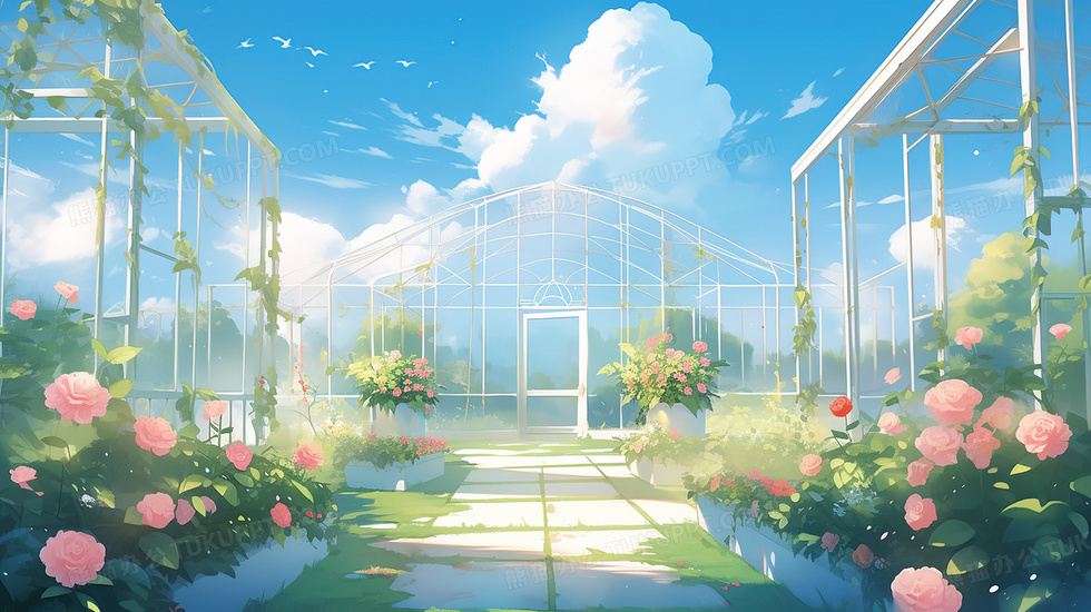 本作品内容为蓝天白云唯美梦幻玻璃花房下的粉色玫瑰花创意插画, 格式为 jpg, 大小6 MB, 图片尺寸为2912 x 1632, 源文件无水印, 欢迎使用熊猫办公。 如认为平台内容涉嫌侵权,可通过邮件:tousu@tukuppt.com提出书面通知,我们将及时处理。