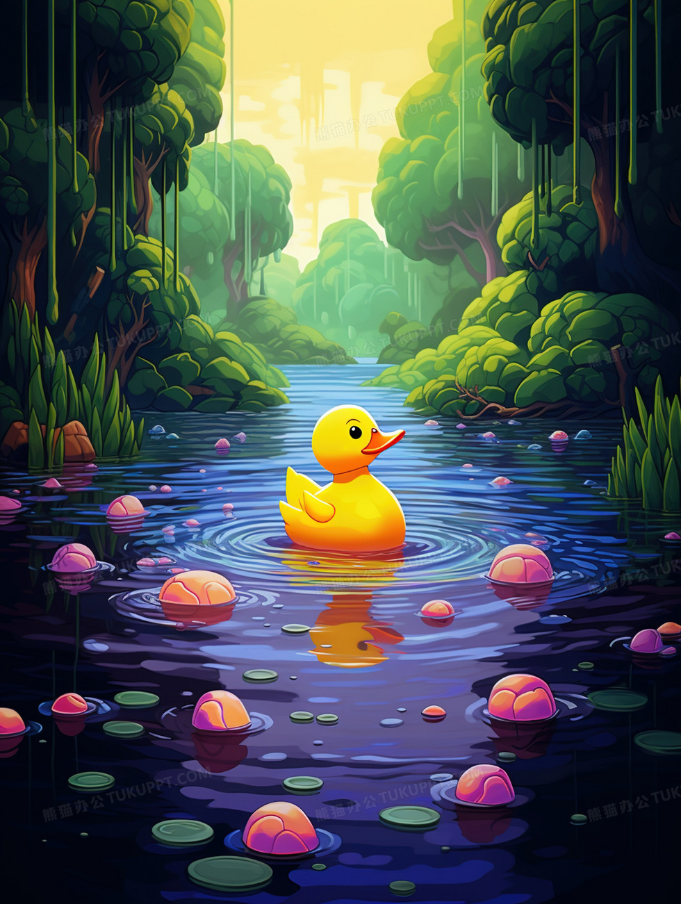 首页 > 插画 > 科技艺术 > 卡通漫画 > 游泳的小黄鸭卡通唯美风景插画