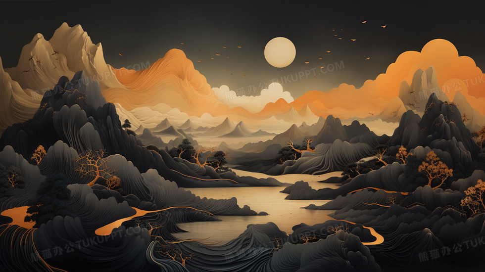 本作品内容为黑金国潮风山水风景插画, 格式为 jpg, 大小5 MB, 图片尺寸为2912 x 1632, 源文件无水印, 欢迎使用熊猫办公。 如认为平台内容涉嫌侵权,可通过邮件:tousu@tukuppt.com提出书面通知,我们将及时处理。