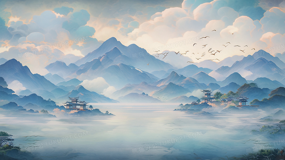 本作品内容为国潮风唯美山水风景插画, 格式为 jpg, 大小5 MB, 图片尺寸为2912 x 1632, 源文件无水印, 欢迎使用熊猫办公。 如认为平台内容涉嫌侵权,可通过邮件:tousu@tukuppt.com提出书面通知,我们将及时处理。