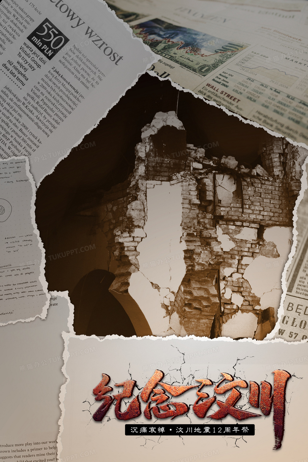 本作品内容为摄图图报纸地震合成背景, 格式为 psd, 大小86 MB, 图片尺寸为3543 x 5314, 作品中背景图片无需修改, 源文件无水印,可以直接使用, 欢迎使用熊猫办公。 如认为平台内容涉嫌侵权,可通过邮件:tousu@tukuppt.com提出书面通知,我们将及时处理。