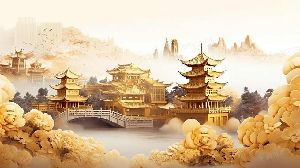 本作品内容为金色奢华大气创意中国风中式园林建筑亭台楼阁创意插画, 格式为 jpg, 大小3 MB, 图片尺寸为2912 x 1632, 源文件无水印, 欢迎使用熊猫办公。 如认为平台内容涉嫌侵权,可通过邮件:tousu@tukuppt.com提出书面通知,我们将及时处理。