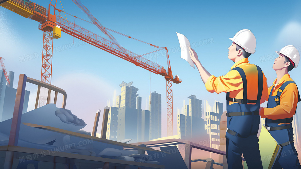 本作品内容为2个戴着安全头盔穿着专业的工程师在建筑工地监督施工情况创意插画, 格式为 jpg, 大小3 MB, 图片尺寸为2912 x 1632, 源文件无水印, 欢迎使用熊猫办公。 如认为平台内容涉嫌侵权,可通过邮件:tousu@tukuppt.com提出书面通知,我们将及时处理。