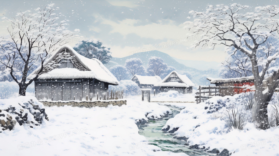 本作品内容为冬季中国小村庄土坯房雪景插画, 格式为 jpg, 大小7 MB, 图片尺寸为2912 x 1632, 源文件无水印, 欢迎使用熊猫办公。 如认为平台内容涉嫌侵权,可通过邮件:tousu@tukuppt.com提出书面通知,我们将及时处理。