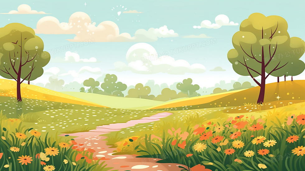 本作品内容为山林里的乡间小道旁的草地花丛春日美景插画, 格式为 jpg, 大小5 MB, 图片尺寸为2912 x 1632, 源文件无水印, 欢迎使用熊猫办公。 如认为平台内容涉嫌侵权,可通过邮件:tousu@tukuppt.com提出书面通知,我们将及时处理。