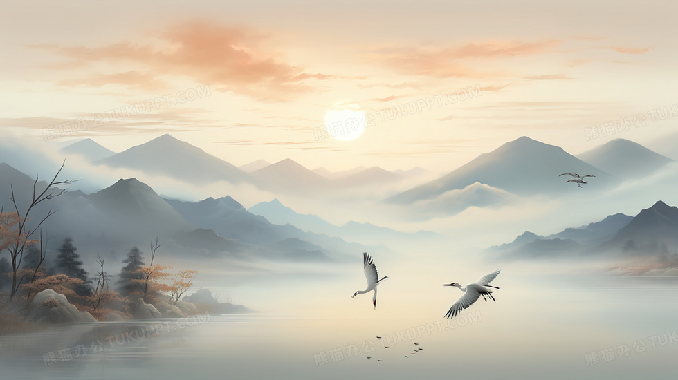 本作品内容为中国风仙鹤山水风景水墨意境插画, 格式为 jpg, 大小4 MB, 图片尺寸为2912 x 1632, 源文件无水印, 欢迎使用熊猫办公。 如认为平台内容涉嫌侵权,可通过邮件:tousu@tukuppt.com提出书面通知,我们将及时处理。