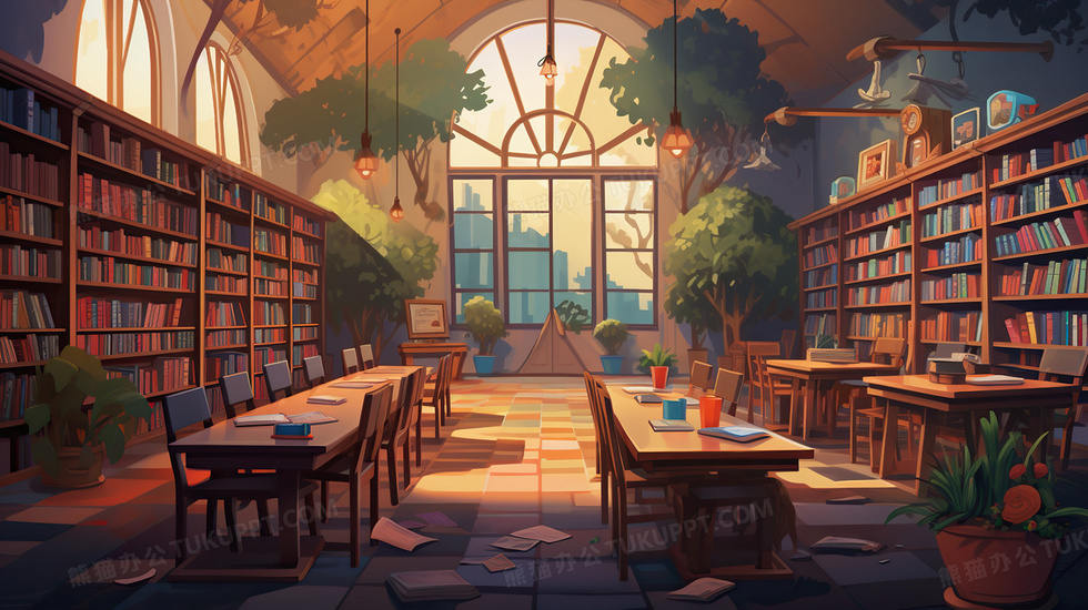 本作品内容为学校场景图书馆插画, 格式为 jpg, 大小6 MB, 图片尺寸为2912 x 1632, 源文件无水印, 欢迎使用熊猫办公。 如认为平台内容涉嫌侵权,可通过邮件:tousu@tukuppt.com提出书面通知,我们将及时处理。