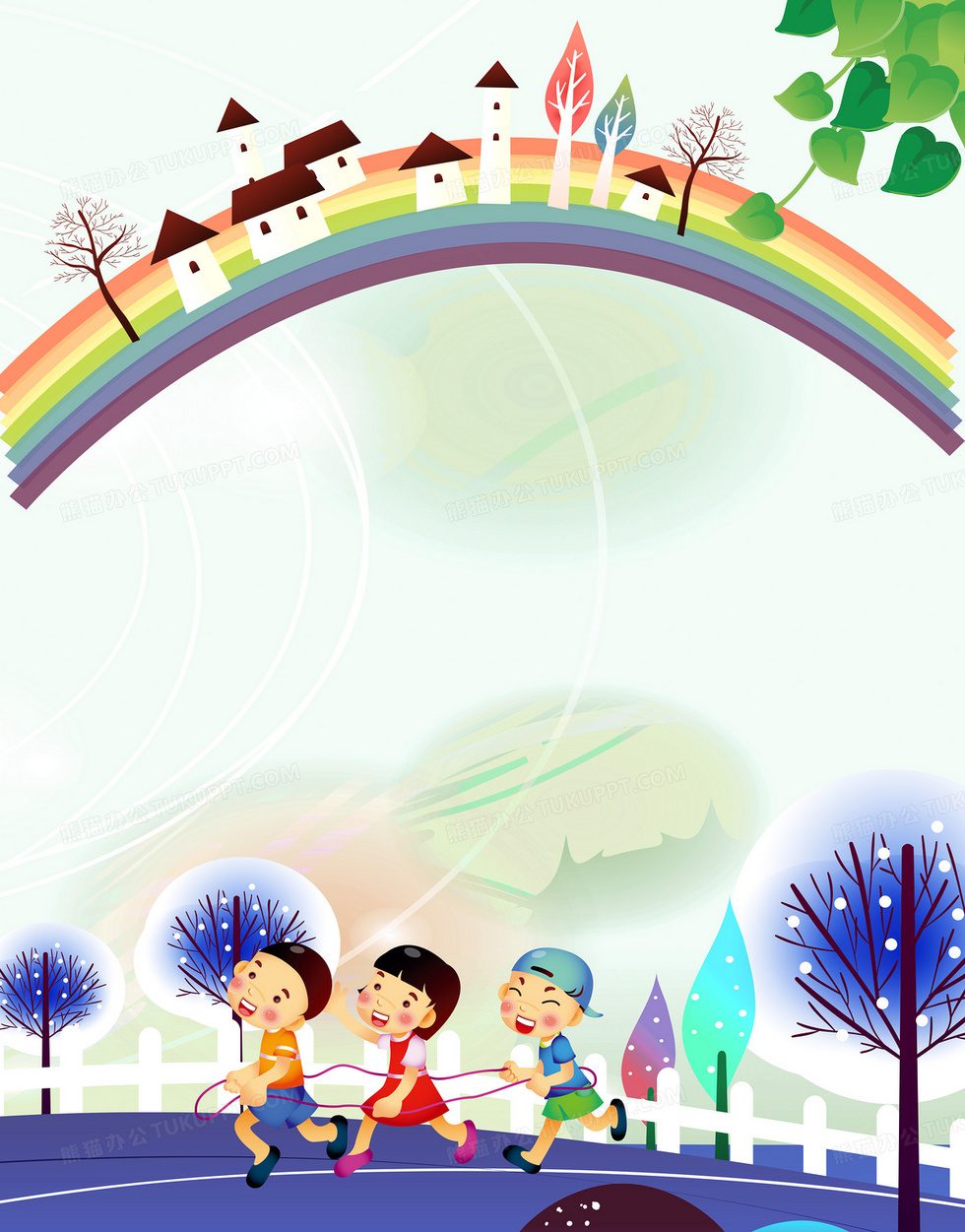 本作品内容为卡通小孩彩虹淡绿色背景素材, 格式为 psd, 图片尺寸为2776 x 3543, 作品中背景图片无需修改, 源文件无水印,可以直接使用, 欢迎使用熊猫办公。 如认为平台内容涉嫌侵权,可通过邮件:tousu@tukuppt.com提出书面通知,我们将及时处理。
