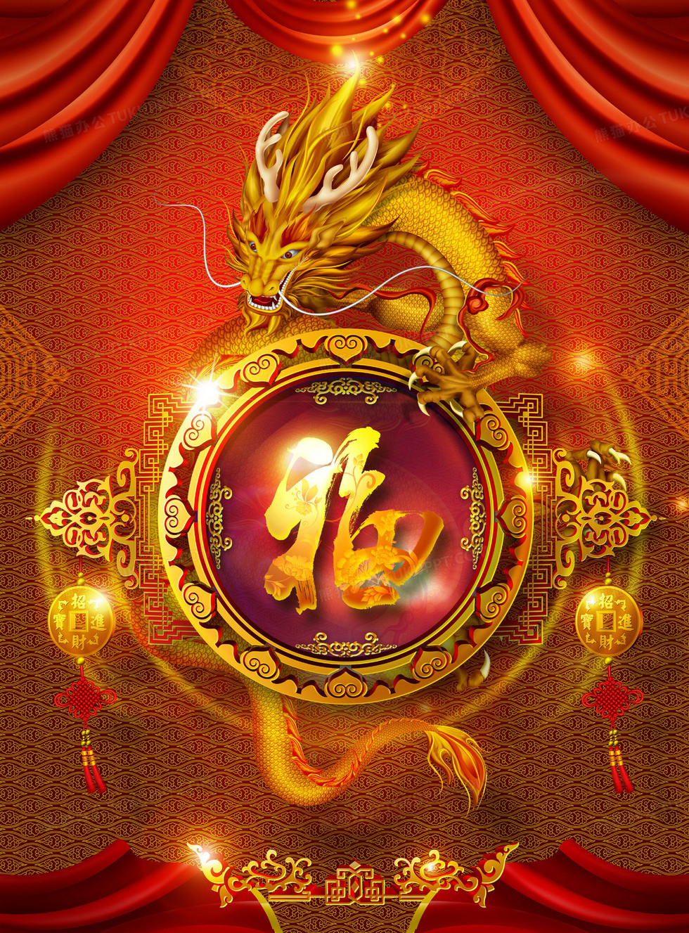 本作品内容为中国风大红龙喜庆福字背景, 格式为 psd, 图片尺寸为2000 x 2708, 作品中背景图片无需修改, 源文件无水印,可以直接使用, 欢迎使用熊猫办公。 如认为平台内容涉嫌侵权,可通过邮件:tousu@tukuppt.com提出书面通知,我们将及时处理。