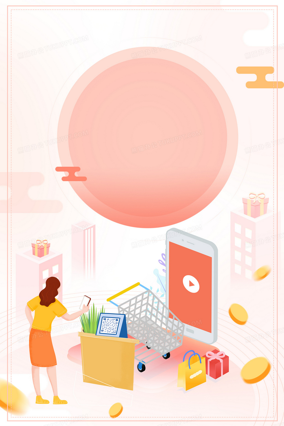 本作品内容为购物移动支付扫码支付卡通背景, 格式为 psd, 大小31 MB, 图片尺寸为3543 x 5315, 作品中背景图片无需修改, 源文件无水印,可以直接使用, 欢迎使用熊猫办公。 如认为平台内容涉嫌侵权,可通过邮件:tousu@tukuppt.com提出书面通知,我们将及时处理。