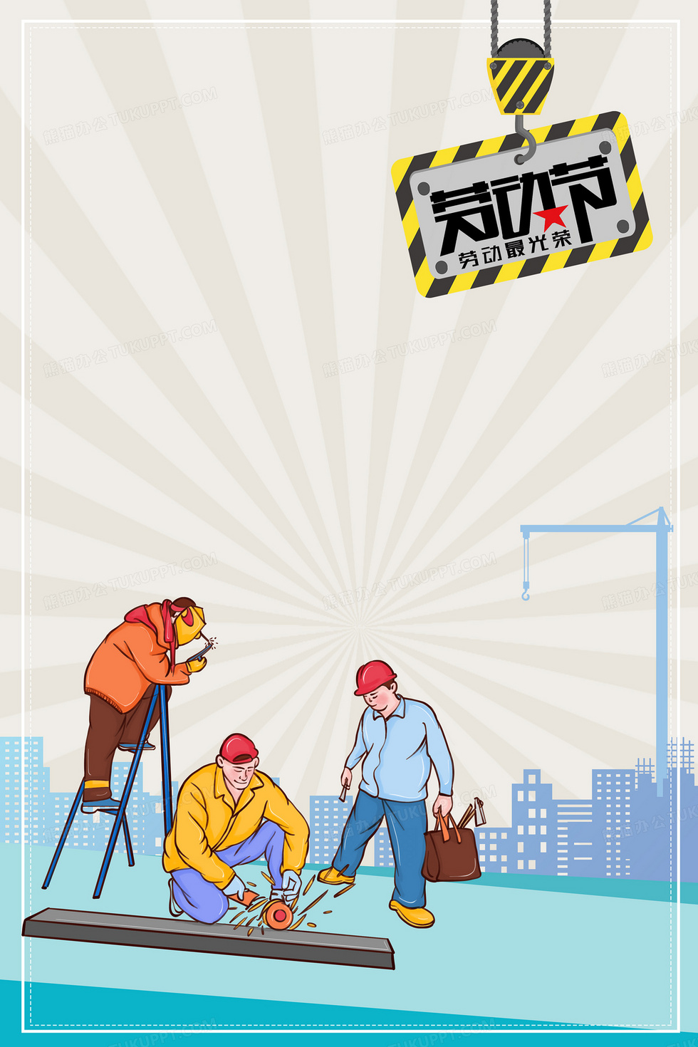 本作品内容为劳动节勤劳建筑工人卡通背景, 格式为 psd, 大小9 MB, 图片尺寸为3543 x 5315, 作品中背景图片无需修改, 源文件无水印,可以直接使用, 欢迎使用熊猫办公。 如认为平台内容涉嫌侵权,可通过邮件:tousu@tukuppt.com提出书面通知,我们将及时处理。