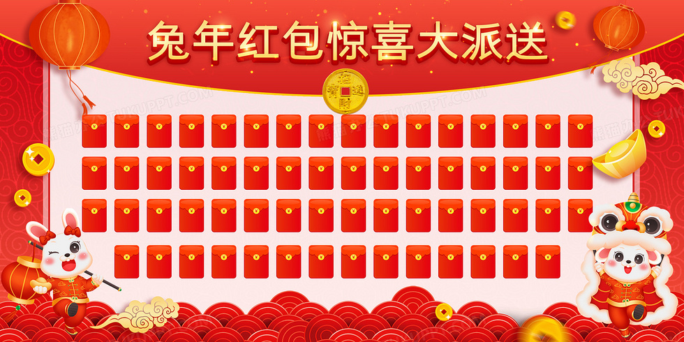 本作品内容为兔年红包大派送红色喜庆背景, 格式为 psd, 大小56 MB, 图片尺寸为4724 x 2362, 作品中背景图片无需修改, 源文件无水印,可以直接使用, 欢迎使用熊猫办公。 如认为平台内容涉嫌侵权,可通过邮件:tousu@tukuppt.com提出书面通知,我们将及时处理。
