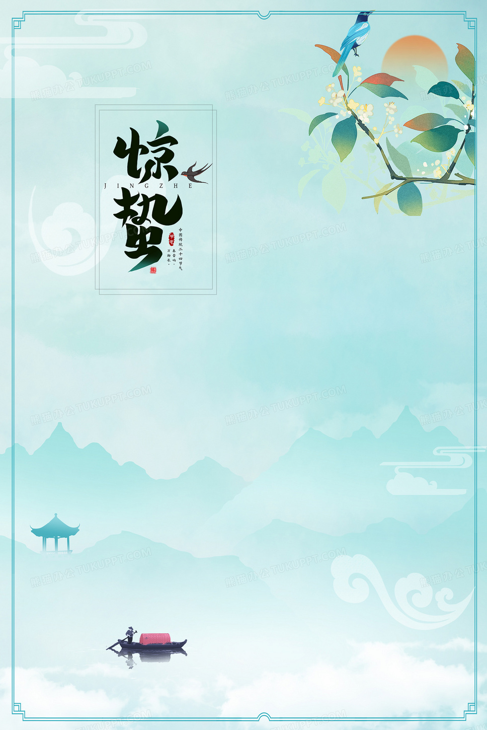 本作品内容为清新中国风二十四节气惊蛰山水意境背景, 格式为 psd, 大小94 MB, 图片尺寸为3543 x 5315, 作品中背景图片无需修改, 源文件无水印,可以直接使用, 欢迎使用熊猫办公。 如认为平台内容涉嫌侵权,可通过邮件:tousu@tukuppt.com提出书面通知,我们将及时处理。