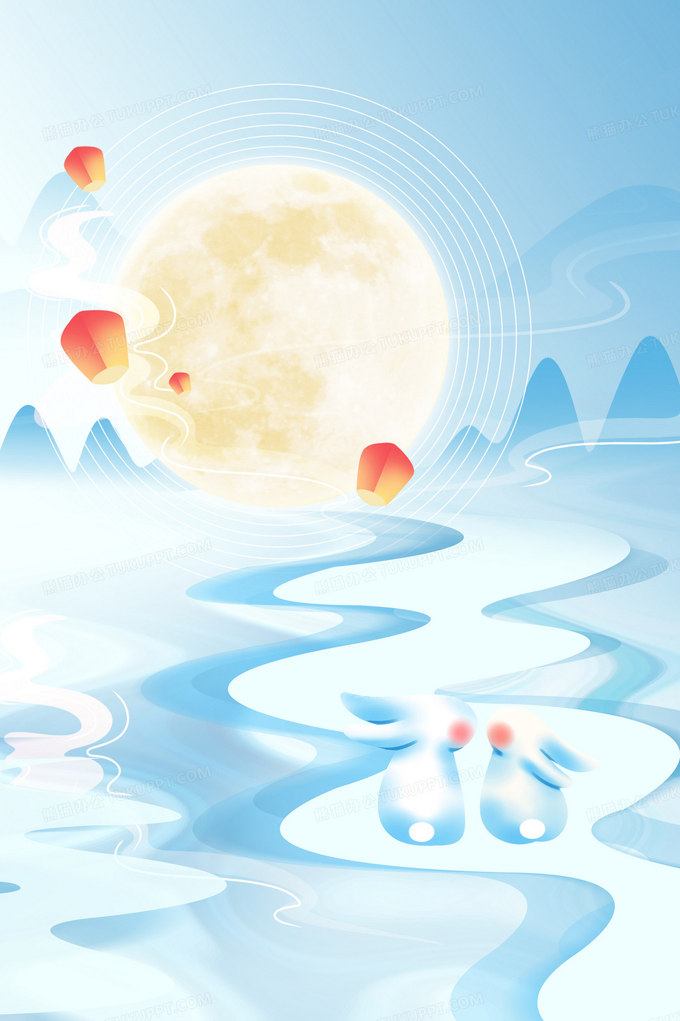 本作品内容为中国风清新水流山水圆月玉兔中秋节背景, 格式为 psd, 大小56 MB, 图片尺寸为3543 x 5315, 作品中背景图片无需修改, 源文件无水印,可以直接使用, 欢迎使用熊猫办公。 如认为平台内容涉嫌侵权,可通过邮件:tousu@tukuppt.com提出书面通知,我们将及时处理。