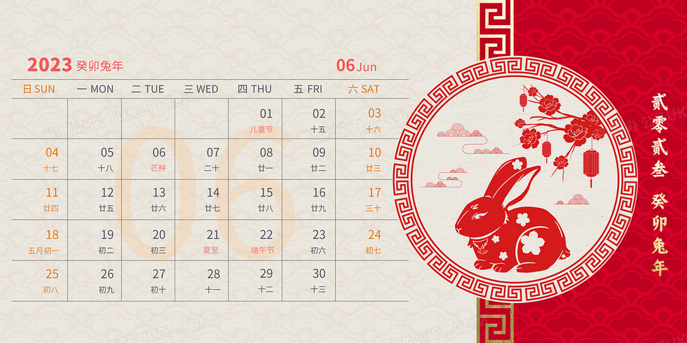 本作品内容为红色烫金兔年六月日历装饰素材, 格式为 psd, 大小54 MB, 图片尺寸为4724 x 2362, 作品中背景图片无需修改, 源文件无水印,可以直接使用, 欢迎使用熊猫办公。 如认为平台内容涉嫌侵权,可通过邮件:tousu@tukuppt.com提出书面通知,我们将及时处理。