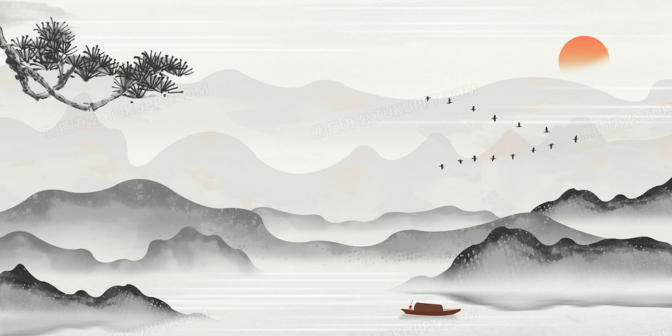 本作品内容为简约中国风水墨山水渔船背景, 格式为 psd, 大小41 MB, 图片尺寸为4724 x 2362, 作品中背景图片无需修改, 源文件无水印,可以直接使用, 欢迎使用熊猫办公。 如认为平台内容涉嫌侵权,可通过邮件:tousu@tukuppt.com提出书面通知,我们将及时处理。