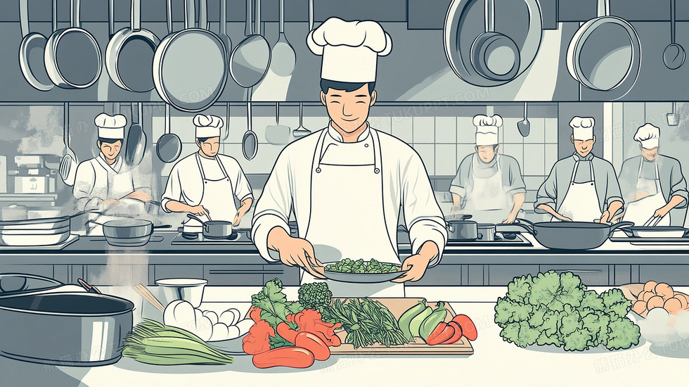 本作品内容为厨师做饭烹饪美食插画, 格式为 jpg, 大小3 MB, 图片尺寸为2912 x 1632, 源文件无水印, 欢迎使用熊猫办公。 如认为平台内容涉嫌侵权,可通过邮件:tousu@tukuppt.com提出书面通知,我们将及时处理。