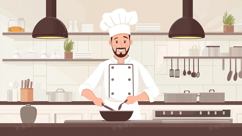 本作品内容为厨师在厨房做饭插画, 格式为 jpg, 大小2 MB, 图片尺寸为2912 x 1632, 源文件无水印, 欢迎使用熊猫办公。 如认为平台内容涉嫌侵权,可通过邮件:tousu@tukuppt.com提出书面通知,我们将及时处理。