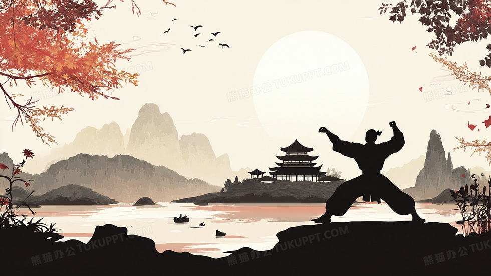 本作品内容为武术水墨中国风人物山水背景, 格式为 jpg, 大小3 MB, 图片尺寸为2912 x 1632, 作品中背景图片无需修改, 源文件无水印,可以直接使用, 欢迎使用熊猫办公。 如认为平台内容涉嫌侵权,可通过邮件:tousu@tukuppt.com提出书面通知,我们将及时处理。