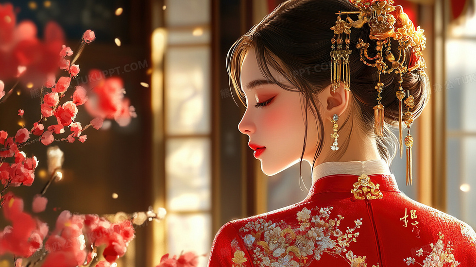 本作品内容为中式婚礼新娘红色喜庆装扮插画, 格式为 jpg, 大小4 MB, 图片尺寸为2912 x 1632, 源文件无水印, 欢迎使用熊猫办公。 如认为平台内容涉嫌侵权,可通过邮件:tousu@tukuppt.com提出书面通知,我们将及时处理。
