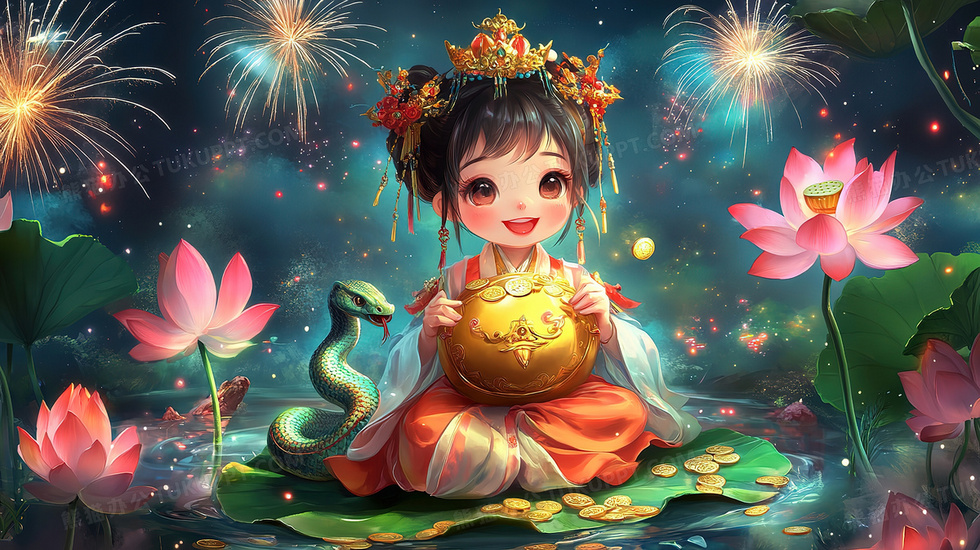 首页 > 插画 > 科技艺术 > 卡通漫画 > 喜庆蛇年荷叶上抱金砖女孩与蛇烟花插画