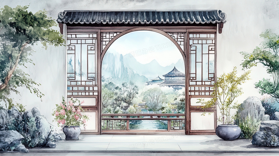 本作品内容为唯美园林古风弧形中式窗牖插画, 格式为 jpg, 大小4 MB, 图片尺寸为2912 x 1632, 源文件无水印, 欢迎使用熊猫办公。 如认为平台内容涉嫌侵权,可通过邮件:tousu@tukuppt.com提出书面通知,我们将及时处理。