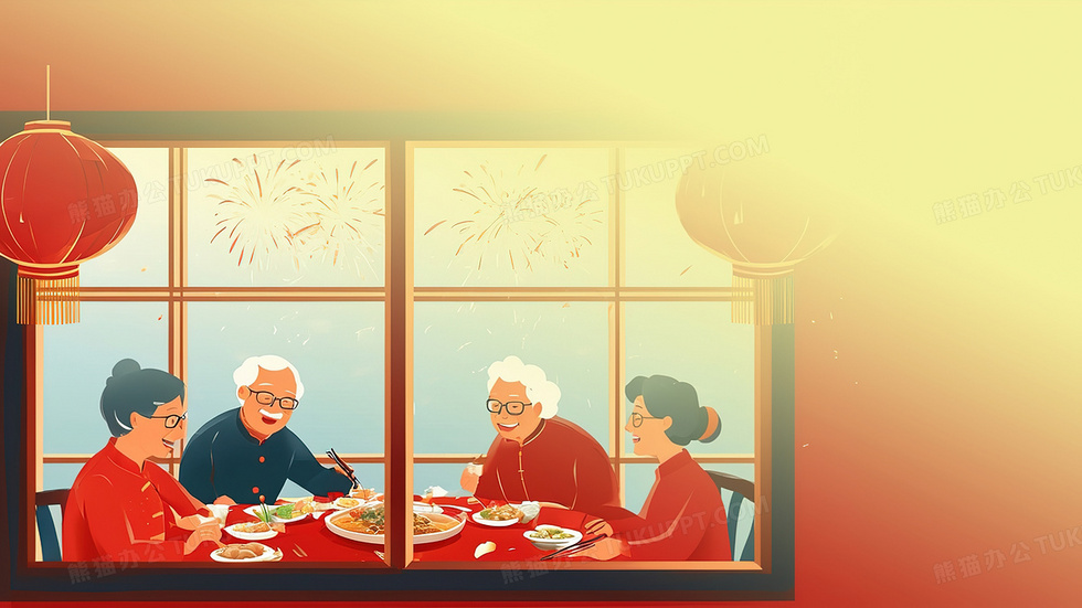 本作品内容为大年三十年夜饭红色背景, 格式为 jpg, 大小3 MB, 图片尺寸为2520 x 1418, 作品中背景图片无需修改, 源文件无水印,可以直接使用, 欢迎使用熊猫办公。 如认为平台内容涉嫌侵权,可通过邮件:tousu@tukuppt.com提出书面通知,我们将及时处理。