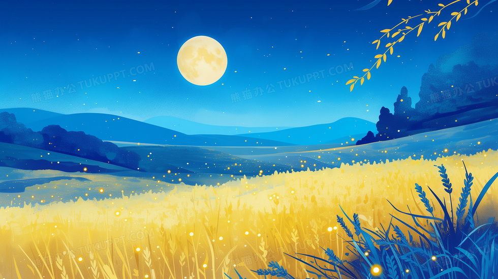 本作品内容为丰收的麦田地夜景插画, 格式为 jpg, 大小7 MB, 图片尺寸为2912 x 1632, 源文件无水印, 欢迎使用熊猫办公。 如认为平台内容涉嫌侵权,可通过邮件:tousu@tukuppt.com提出书面通知,我们将及时处理。