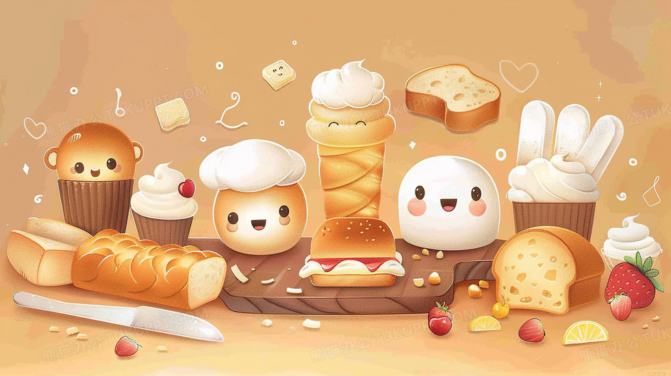 本作品内容为可爱面包厨师烘焙美食可爱拟人插画, 格式为 jpg, 大小3 MB, 图片尺寸为2912 x 1632, 源文件无水印, 欢迎使用熊猫办公。 如认为平台内容涉嫌侵权,可通过邮件:tousu@tukuppt.com提出书面通知,我们将及时处理。