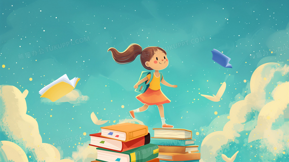 本作品内容为小女孩踩着一摞书创意教育插画, 格式为 jpg, 大小5 MB, 图片尺寸为2912 x 1632, 源文件无水印, 欢迎使用熊猫办公。 如认为平台内容涉嫌侵权,可通过邮件:tousu@tukuppt.com提出书面通知,我们将及时处理。