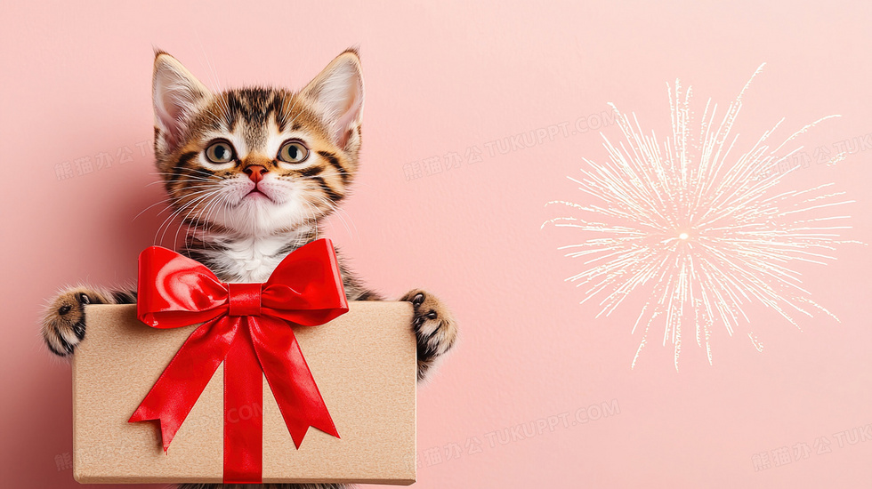 本作品内容为可爱猫咪抱着蝴蝶结礼盒烟花背景, 格式为 jpg, 大小2 MB, 图片尺寸为2912 x 1632, 作品中背景图片无需修改, 源文件无水印,可以直接使用, 欢迎使用熊猫办公。 如认为平台内容涉嫌侵权,可通过邮件:tousu@tukuppt.com提出书面通知,我们将及时处理。